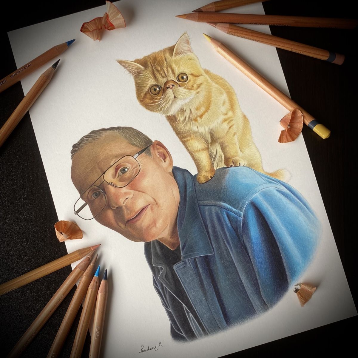 Today I work mainly with colored pencils, because they allow for an almost intimate kind of delicacy: layer by layer, the way memories are built. That essence that makes your companion unmistakably them.