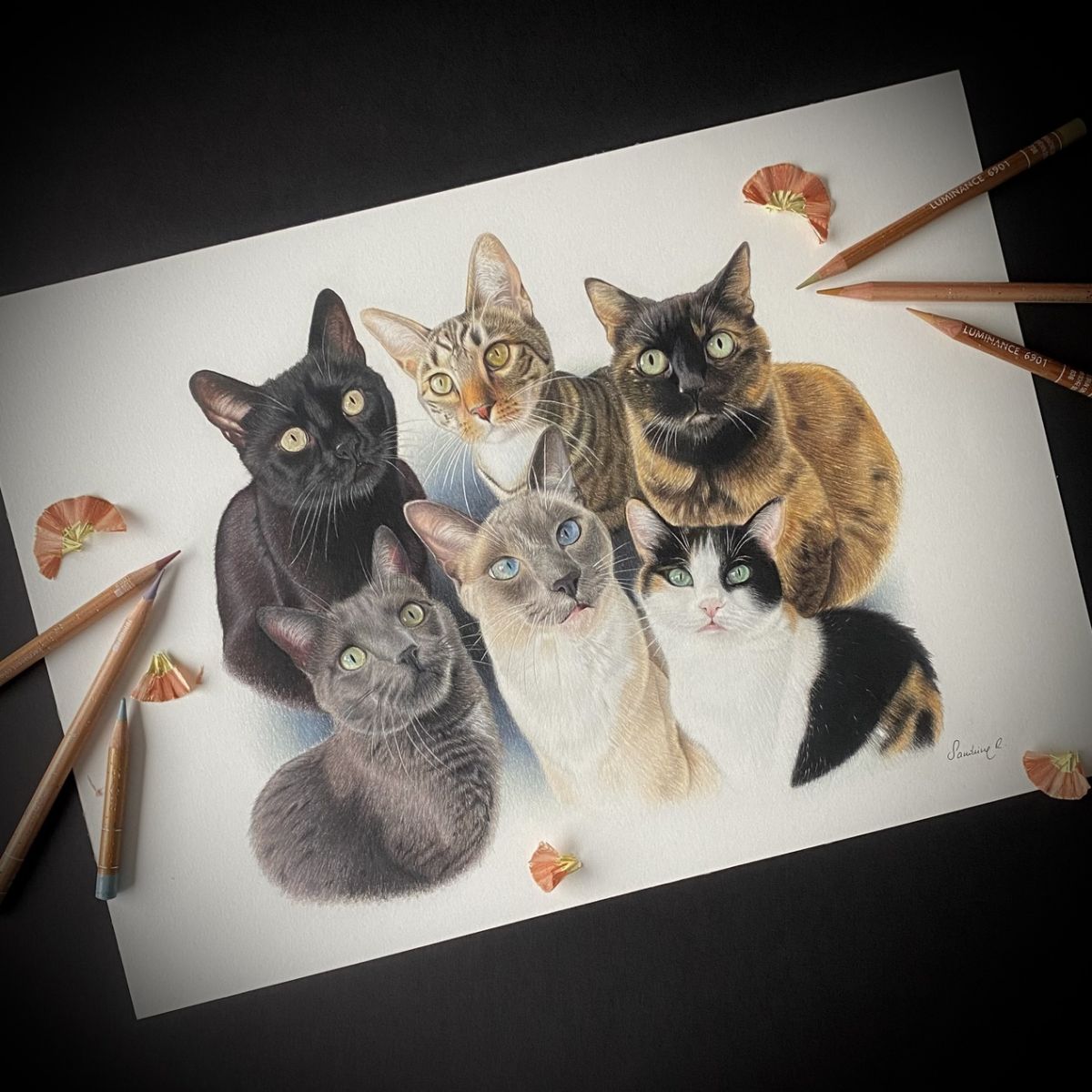 I work from reference photographs, carefully honoring true color, expression, the texture of the fur, and that unique personality that makes every portrait one of a kind.